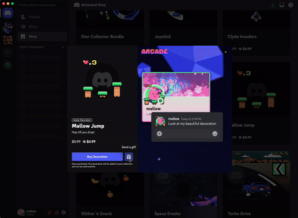 상점에서는 아바타 장식, 프로필 효과, 이름표 등을 미리 보고 구매할 수 있어요. Nitro 멤버는 특정 아이템에 대한 특별 할인 혜택은 물론, 구독 중에 사용할 수 있는 멤버 전용 프로필 아이템 등 상점의 다양한 독점 혜택을 누릴 수 있어요.
