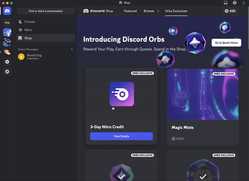 - Nitro 크레딧 - Orbs를 사용해 Nitro 크레딧을 구매하여 Nitro 혜택 일시적으로 이용