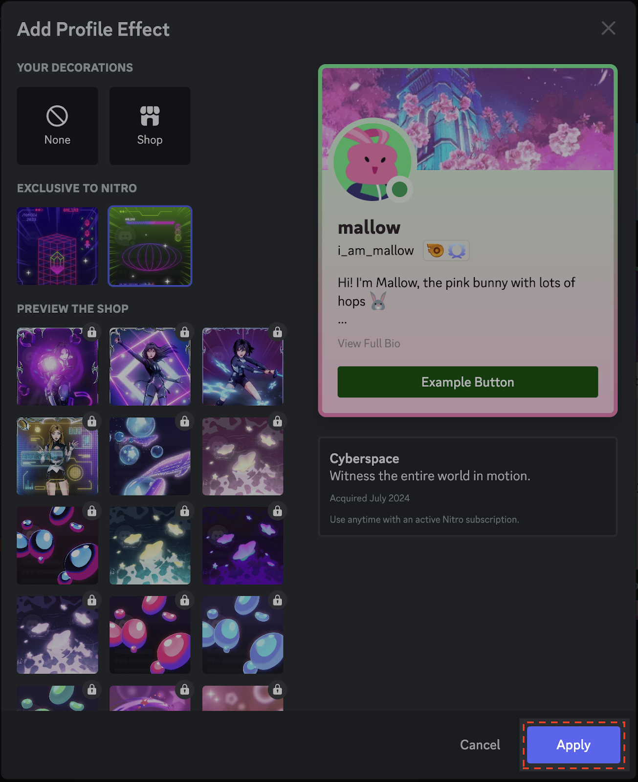 아바타 장식처럼, 구매한 프로필 효과는 소유하시게 되며, 컬렉션에 추가됩니다. 프로필 탭 > 효과 변경에서 찾아볼 수 있습니다. 거기에서 보유 중인 프로필 효과를 적용하거나 상점에 접근하여 추가 효과를 구매할 수 있습니다. 프로필 효과에 대한 자세한 내용은 여기에서 확인하세요.
