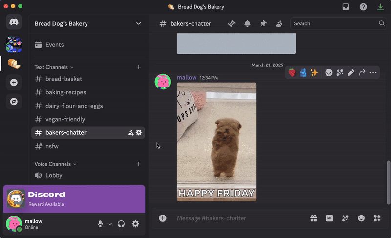 Exempel på att hämta en uppdragsbelöning i Discords app för dator/webbläsare