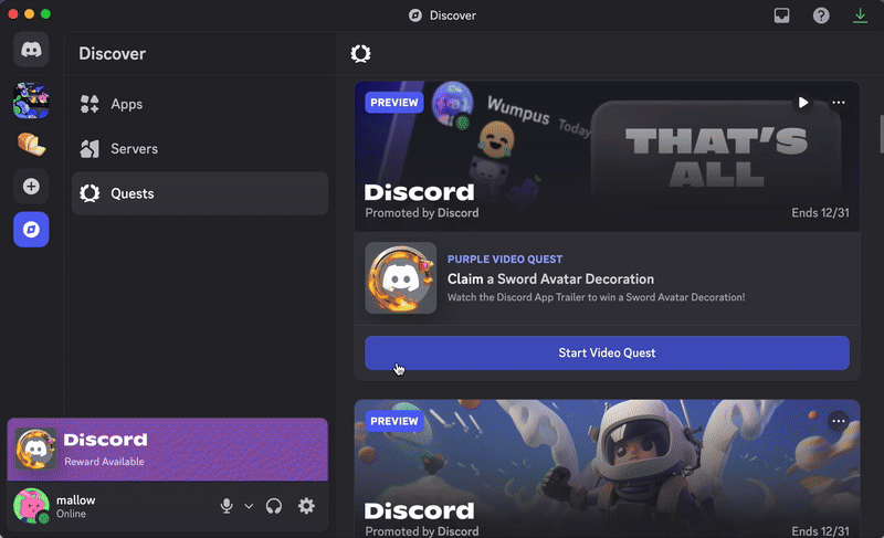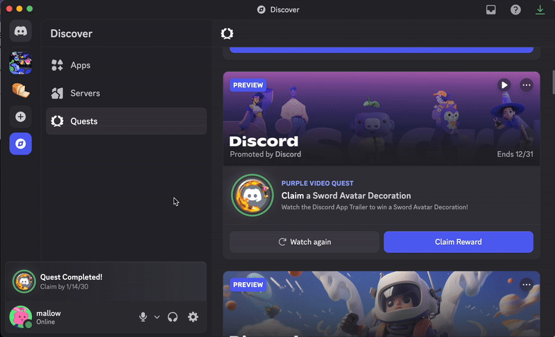 Discord masaüstü/tarayıcı uygulamasında bir Görev ödülü almaya örnek